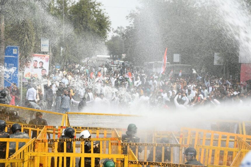 भोपाल. 13 फरवरी. मध्यप्रदेश युवा कांग्रेस कार्यकर्ताओं पर विधानसभा घेराव के दौरान पुलिस ने वाटर कैनन और आंसू गैस के गोले छोड़े। जैसे ही कार्यकर्ता विधानसभा के लिए शिवाजी नगर चौराहा (रेडक्रास हॉस्पिटल के सामने) पहुंचे, पुलिस ने बैरिकेड लगाकर रोक दिया। इस दौरान पीसीसी चीफ जीतू पटवारी और यूथ कांग्रेस के राष्ट्रीय अध्यक्ष श्रीनिवास ने बैरिकेड लांघकर विधानसभा की ओर जाने की कोशिश की।